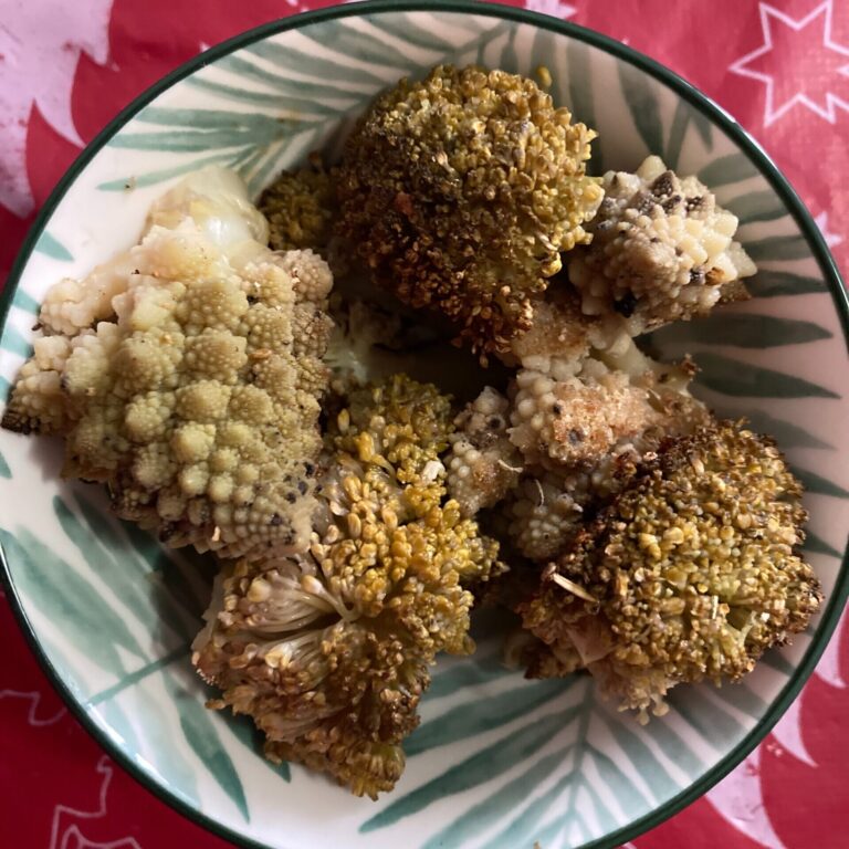 Taglia a cimette il broccolo e cavolo romano, disponili in una teglia da forno e cuoci in forno a 200C per circa 20 minuti, aggiungi il pangrattato e gli aromi. A fine cottura aggiungi l’olio extravergine d’oliva.