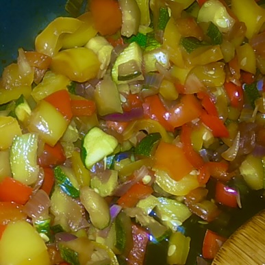 Tagliare i peperoni, le melanzane e le cipolle a listarelle sottili. In una teglia ricoperta da carta forno mettere le verdure già tagliate, aggiungere i capperi, la menta, il sale. Cuocere in forno a 180C per 15/20 minuti. A fine cottura aggiungete l’olio d’oliva extravergine
