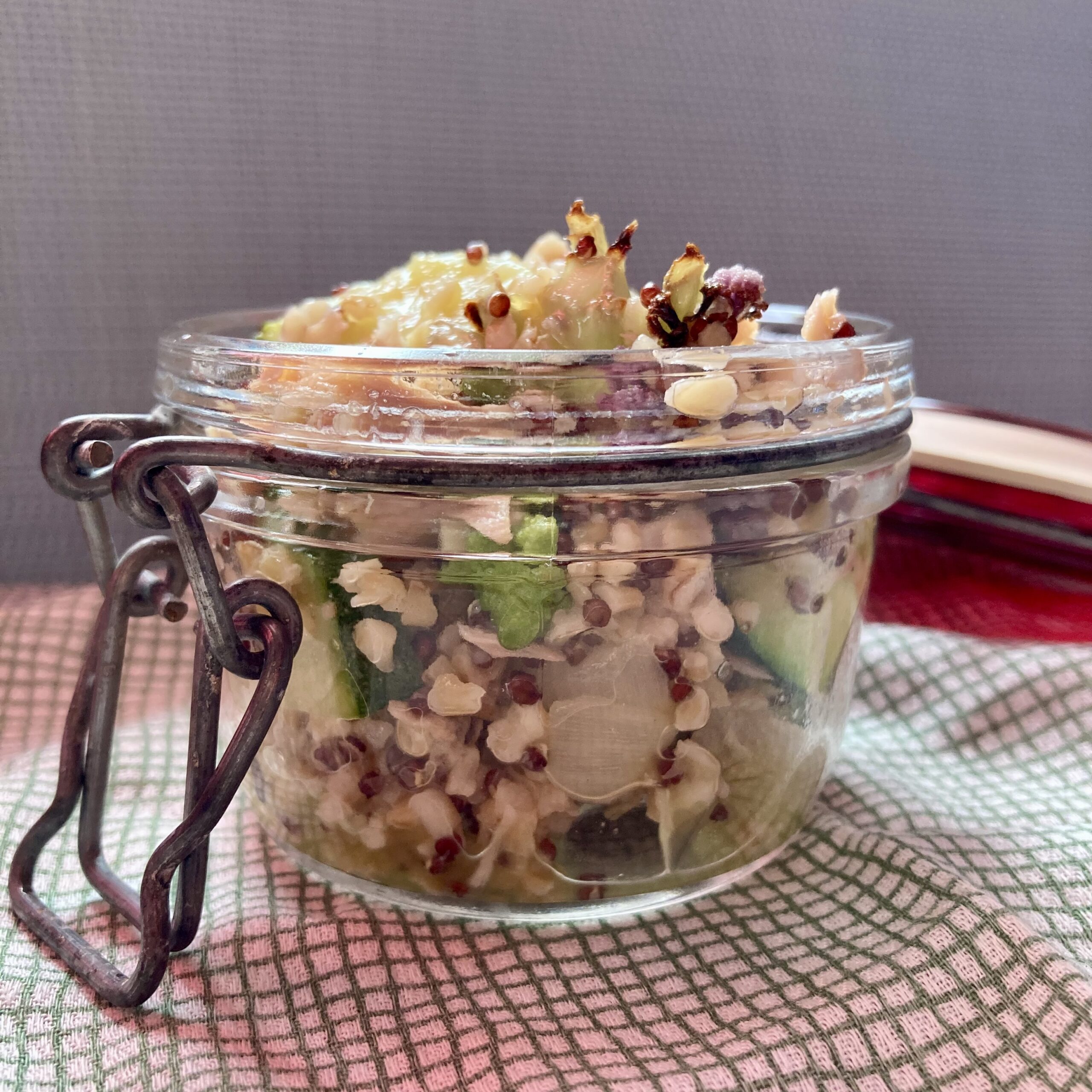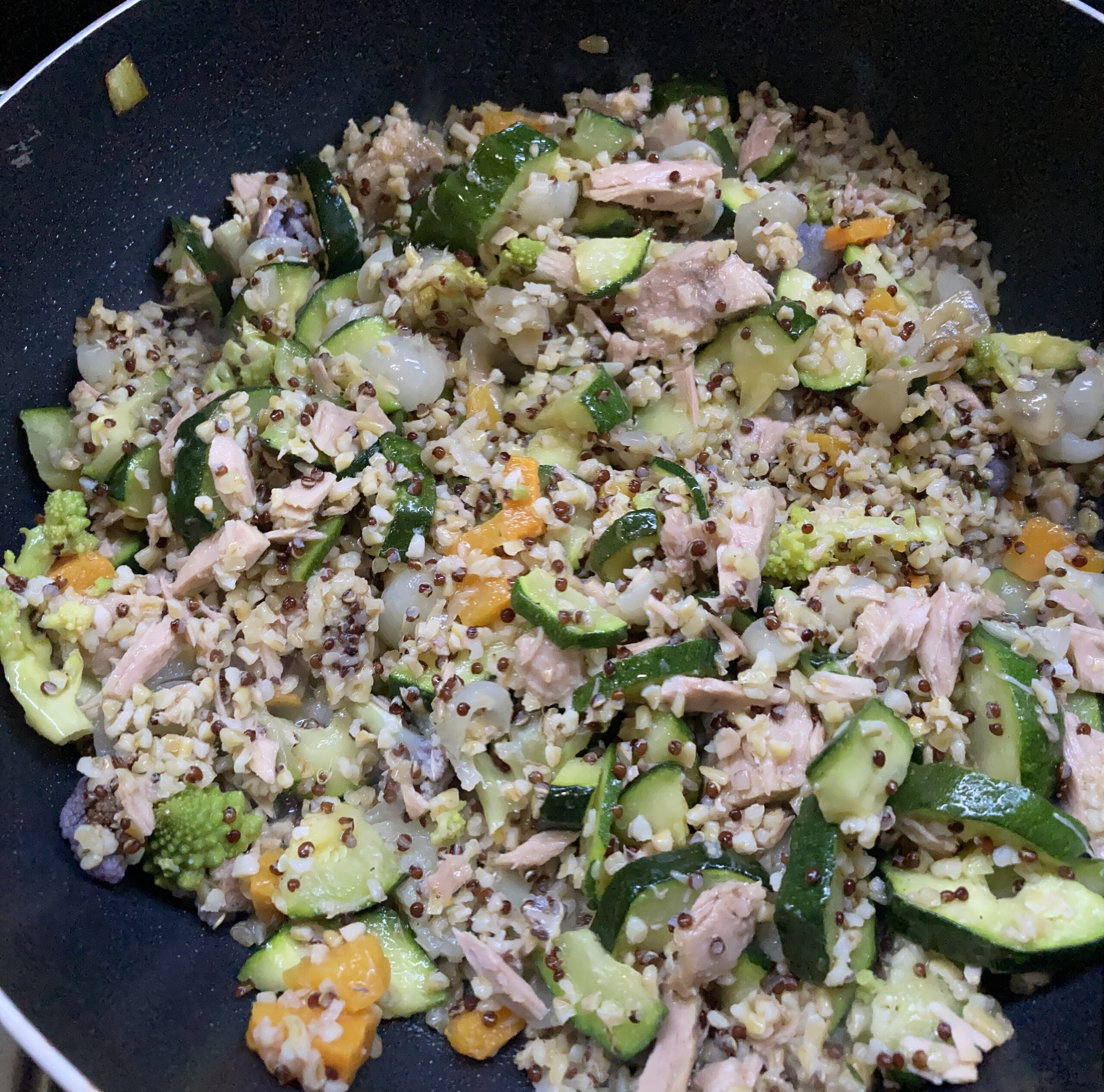 Taglia a fettine sottili le zucchine, mettile in una padella e aggiungi una tazzina d’acqua e cuoci con il coperchio. Inserisci anche la quinoa, aggiungendo acqua fino a cottura. A cottura ultimata aggiungi il tonno e della menta fresca.